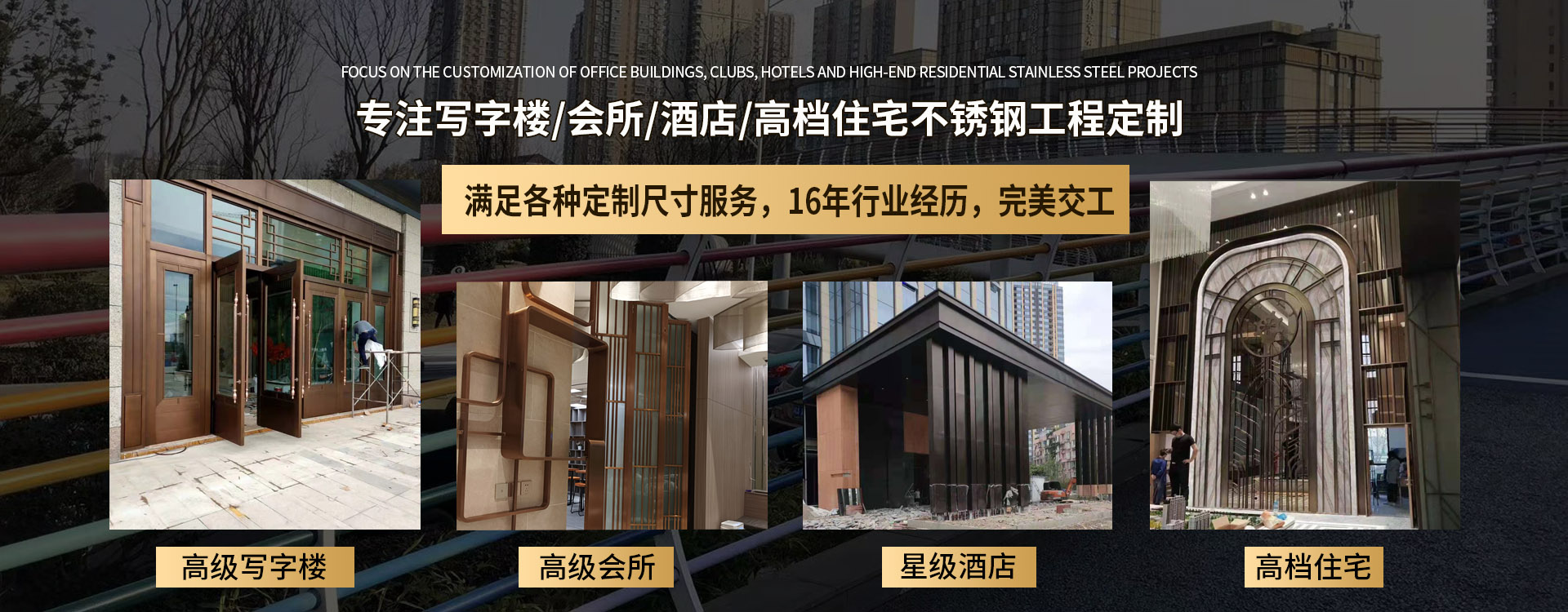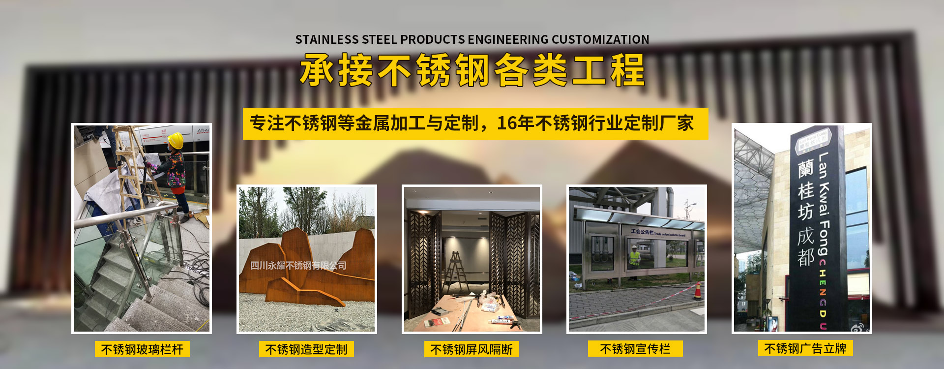 四川永耀不銹鋼有限公司是一家集開發(fā)、設計、加工、制作、安裝、并承接各種不銹鋼工程為一體的綜合性企業。多年來一直在專注于不銹鋼等金屬的加工與研發(fā)。在客戶群體中贏得了良好的聲譽,以專業專注的精神,致辭力于打造良好的產品和企業形象,對每一產品傾注全力,力爭每個細節(jié)精細,確保產品具有優(yōu)越的性能,優(yōu)美的外觀及優(yōu)良的品質,使公司產品深受廣大用戶的親睞。 本公司主要業務: 一、工程類 承攬:酒店、銀行、商鋪、寫字樓、公寓、城鐵、地鐵、公交、機關、 學校、廣場藝術雕塑、自動門、旋轉門、廣告欄、公